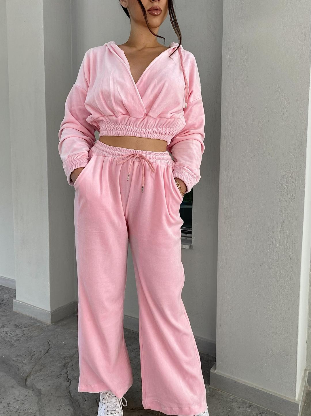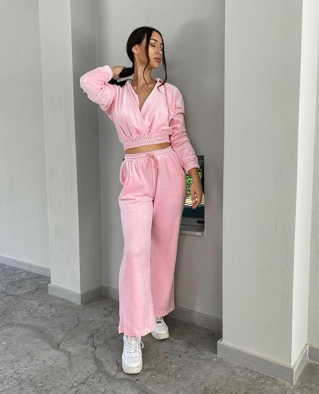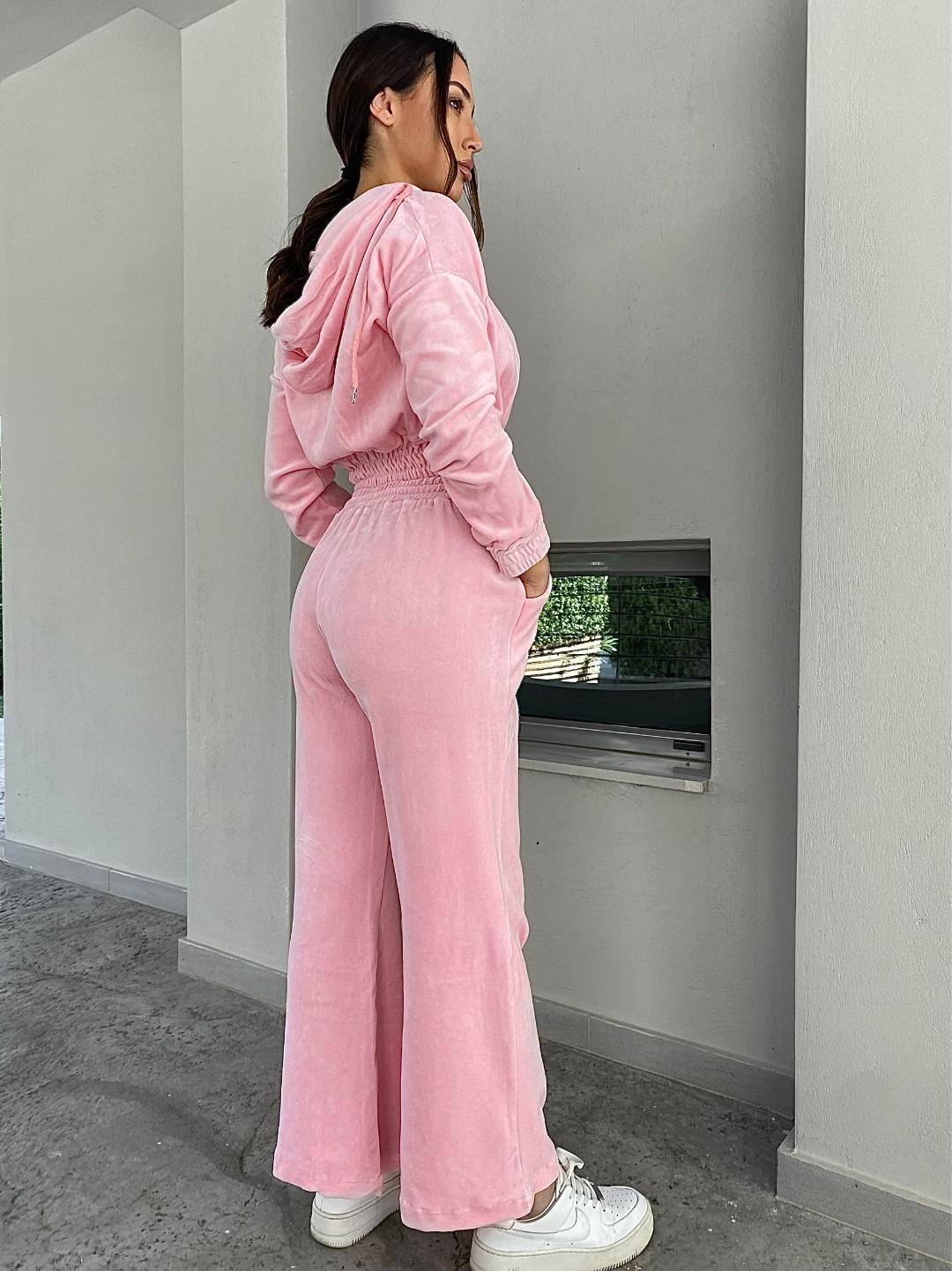 Ροζ βελουτέ σετ φόρμες top με κουκούλα και παντελόνι καμπάνα.