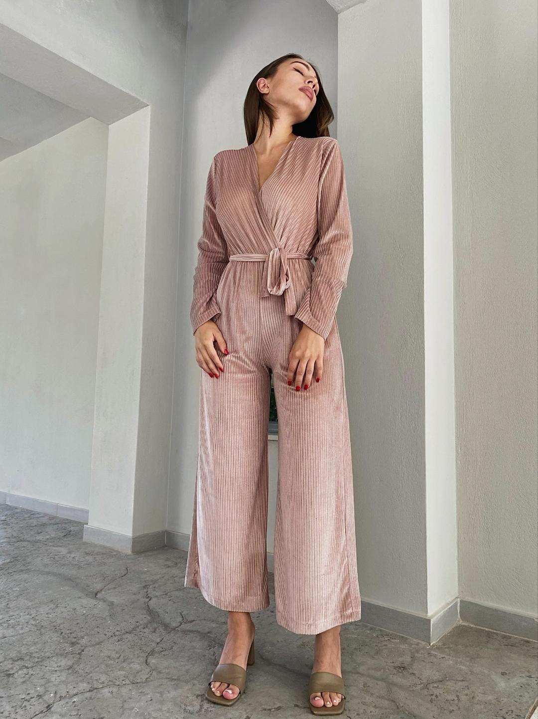 Ροζ βελουτέ ολόσωμη φόρμα κρουαζέ με ζωνάκι στη μέση.