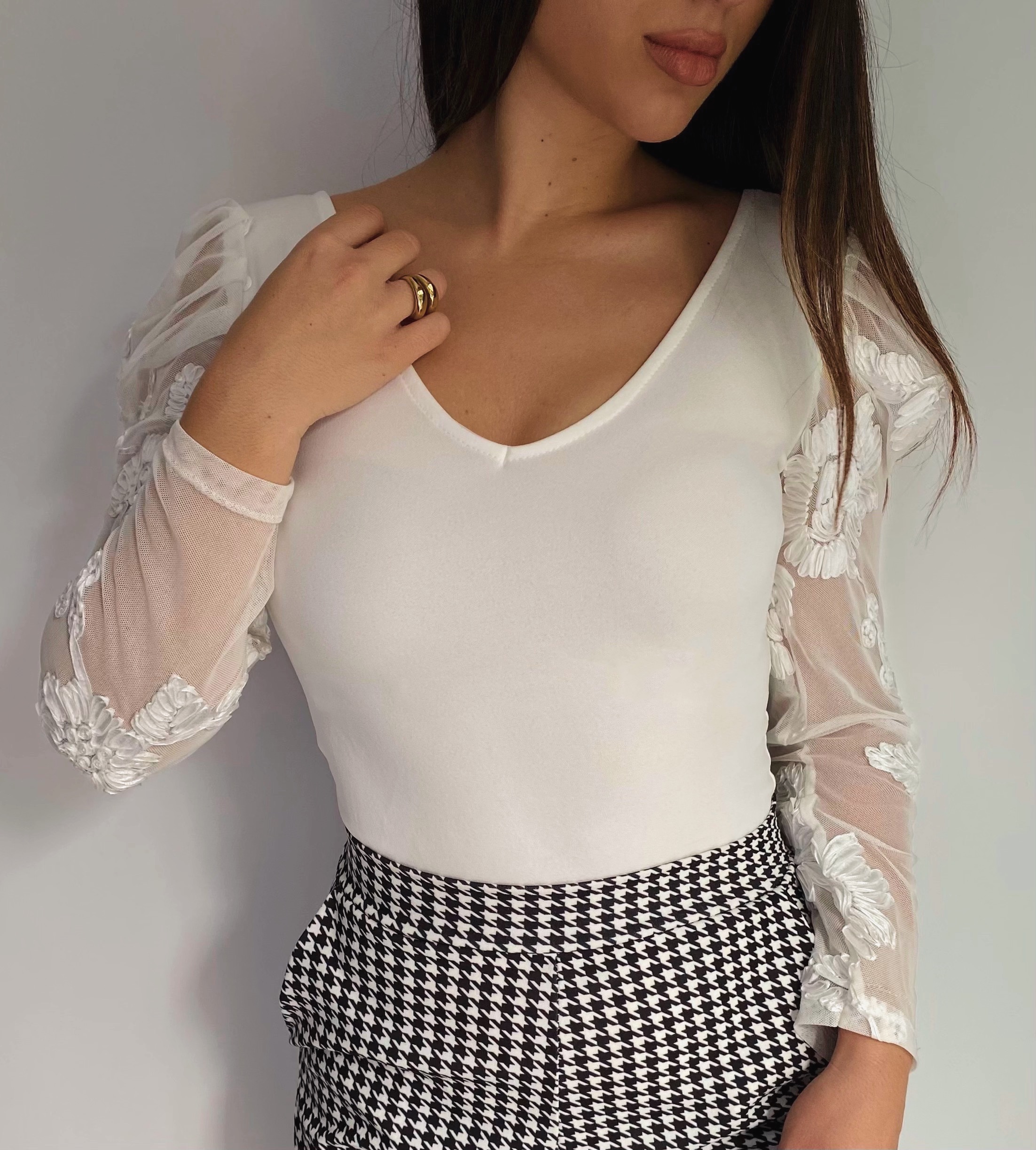 Λευκό κορμάκι με floral κέντημα στο μανίκι.